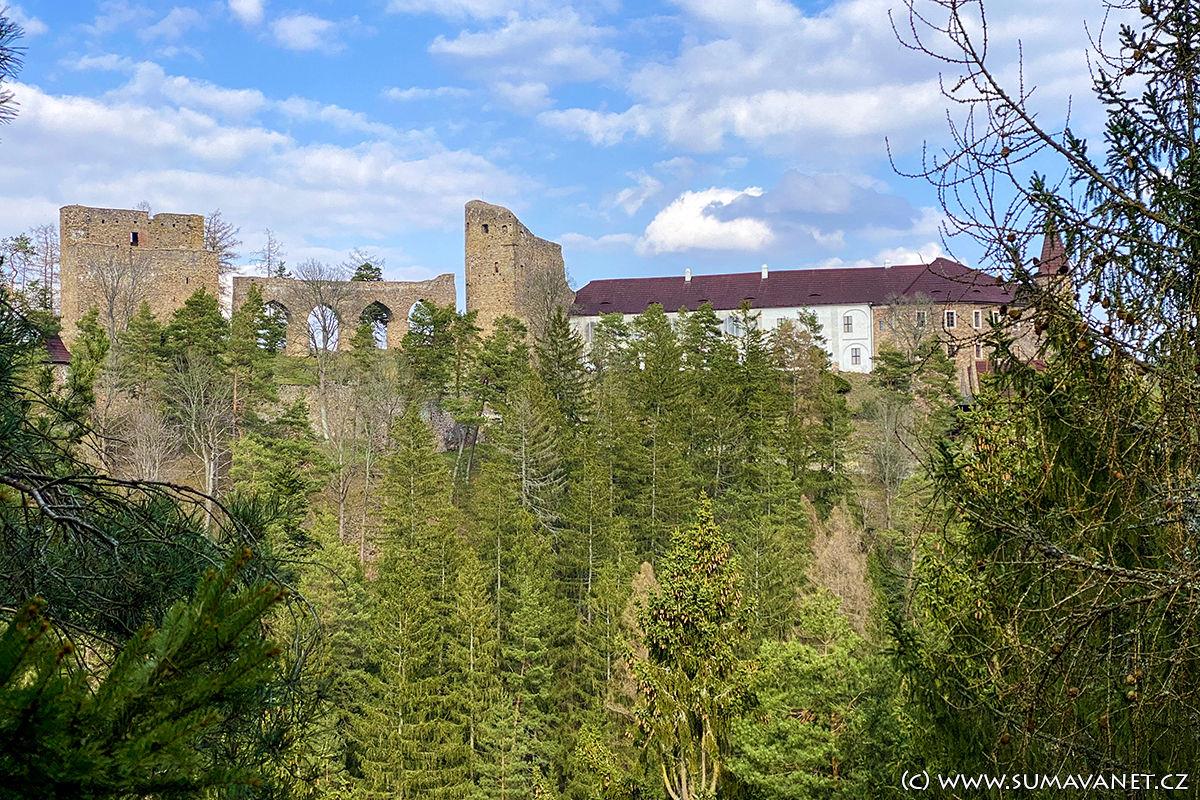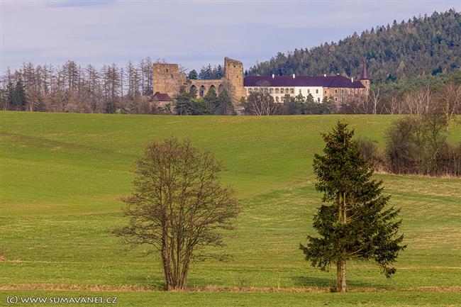 Hrad Velhartice byl založen na přelomu 13. a 14. století na skalním ostrohu, obtékaném říčkou Pstružnou. Tento hrad si patrně jako rodové sídlo pánů z Velhartic počal stavět Bušek starší z Velhartic, hrad dostavoval Bušek mladší, oba byli věrní a oblíbení komorníci Karla IV.